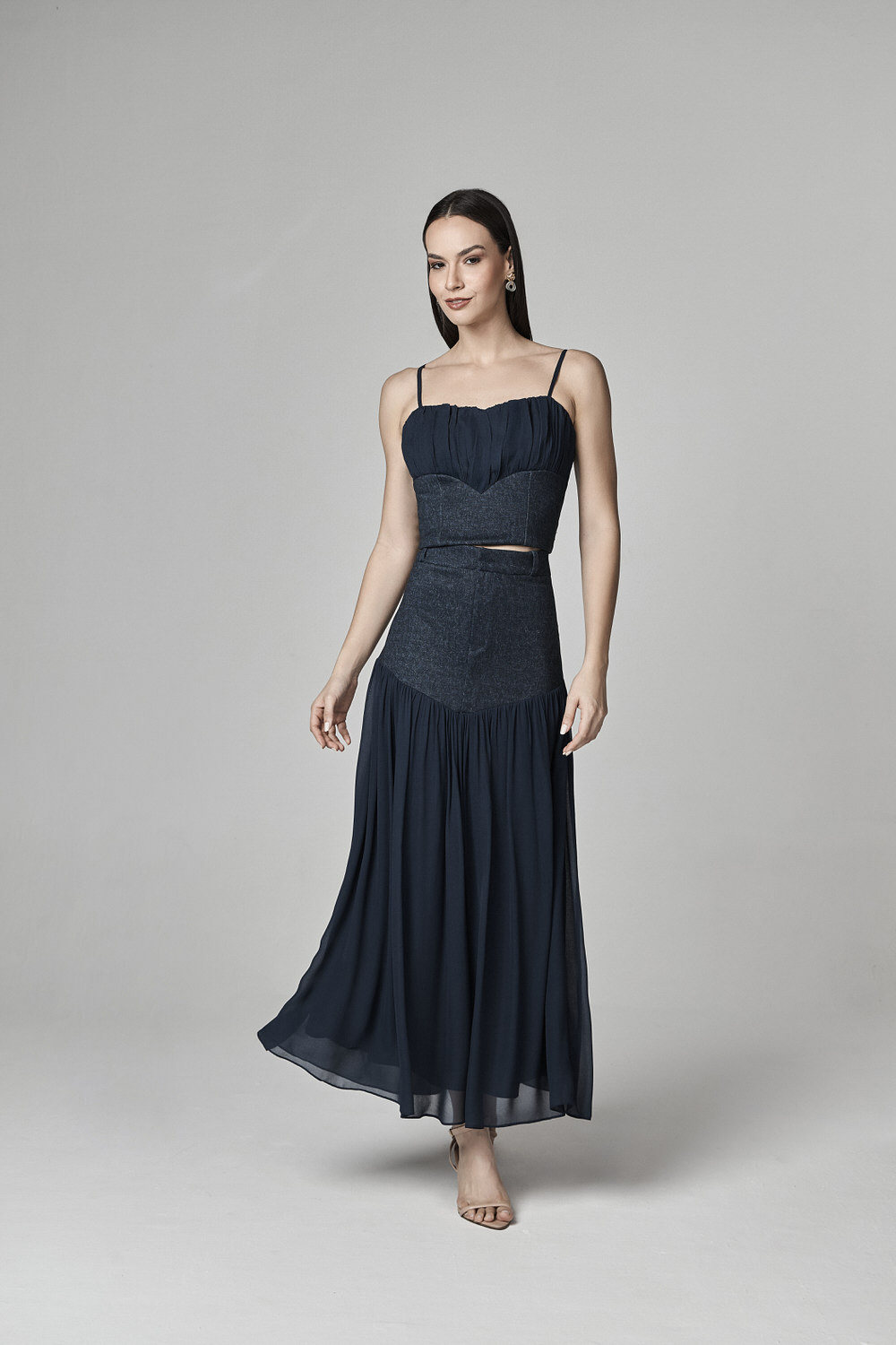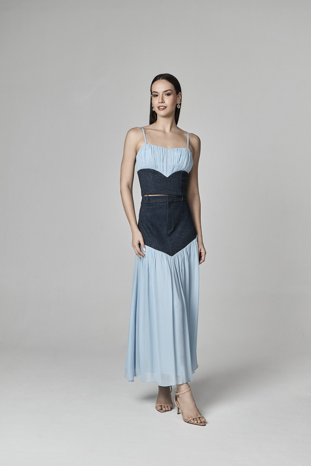 CONJUNTO SAIA MIDI E CROPPED COM MIX DE TECIDOS
